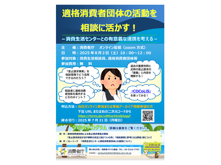 8月2日、消費者庁主催の「適格消費者団体の活動を相談に活かし、消費生活センターとの有意義な連携を考えるための消費生活相談員向け学習会」(WEB開催)に出席しました。